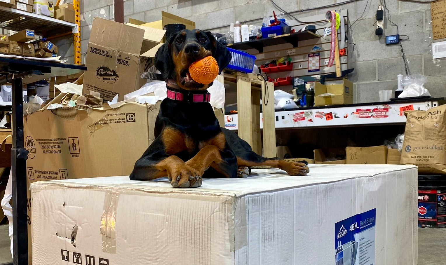 Roma prend son rôle de mascotte de Reef Supplies très au sérieux, surtout quand il s'agit de surveiller les commandes spéciales! Ici, elle monte la garde pour s'assurer que ce sump Ice-Cap est prêt à partir vers sa nouvelle maison. Contrôle qualité approuvé… avec un peu de flair canin!