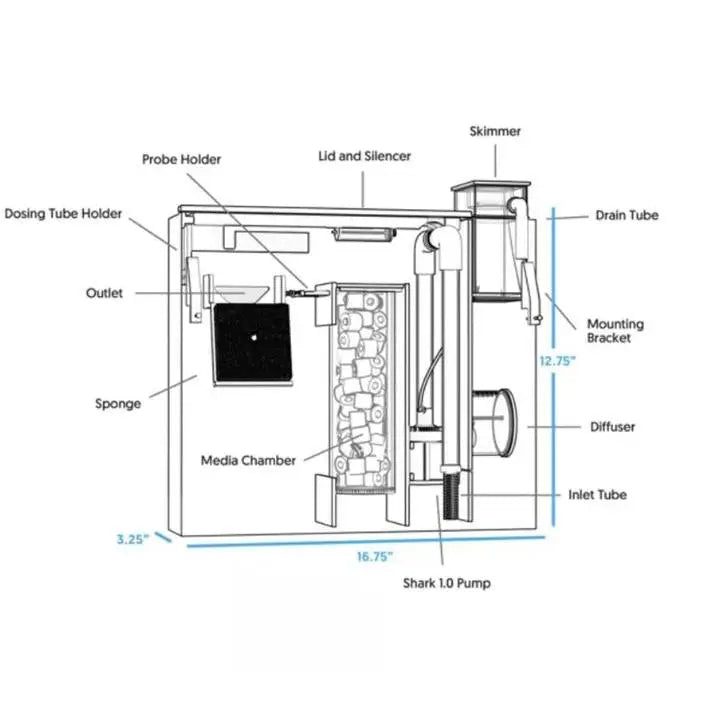 Le système de filtration complet fournit un système de filtration tout compris pour les aquariums d'eau salée. Cela comprend un écumeur de protéines intégré, un réacteur de média biologique et un espace pour ajouter le média de votre choix, tel que du charbon ou des éliminateurs de phosphate. Il fonctionne bien pour les aquariums de 20 à 60 gallons où la longueur est d'au moins 18" et l'épaisseur du verre/bord ne dépasse pas 0.75".